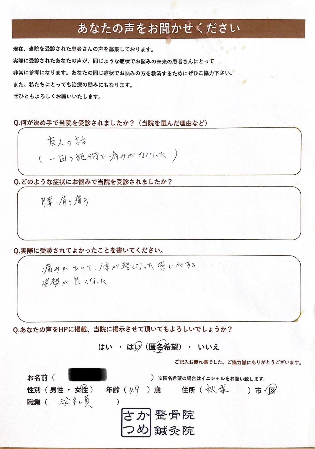 患者様より当院で身体の不調が改善した「お喜びの声」をいただきましたので、