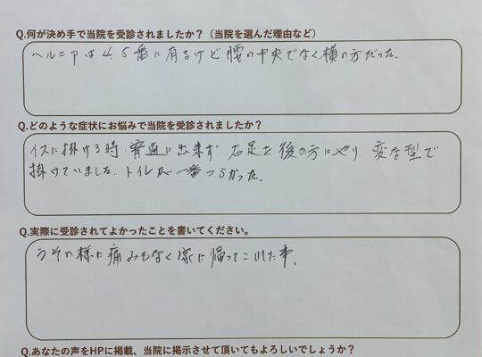患者様より当院で身体の不調が改善した「お喜びの声」をいただきましたので、