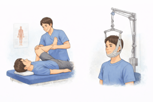 理学療法では、理学療法士による運動療法や牽引療法が行われます。