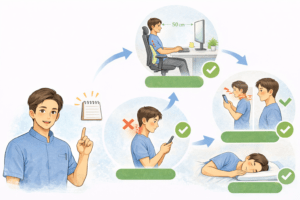デスクワーク時の適切な姿勢、スマートフォン使用時の注意点、睡眠時の枕の選び方など、日常生活の中で実践できる具体的な方法をお教えします。