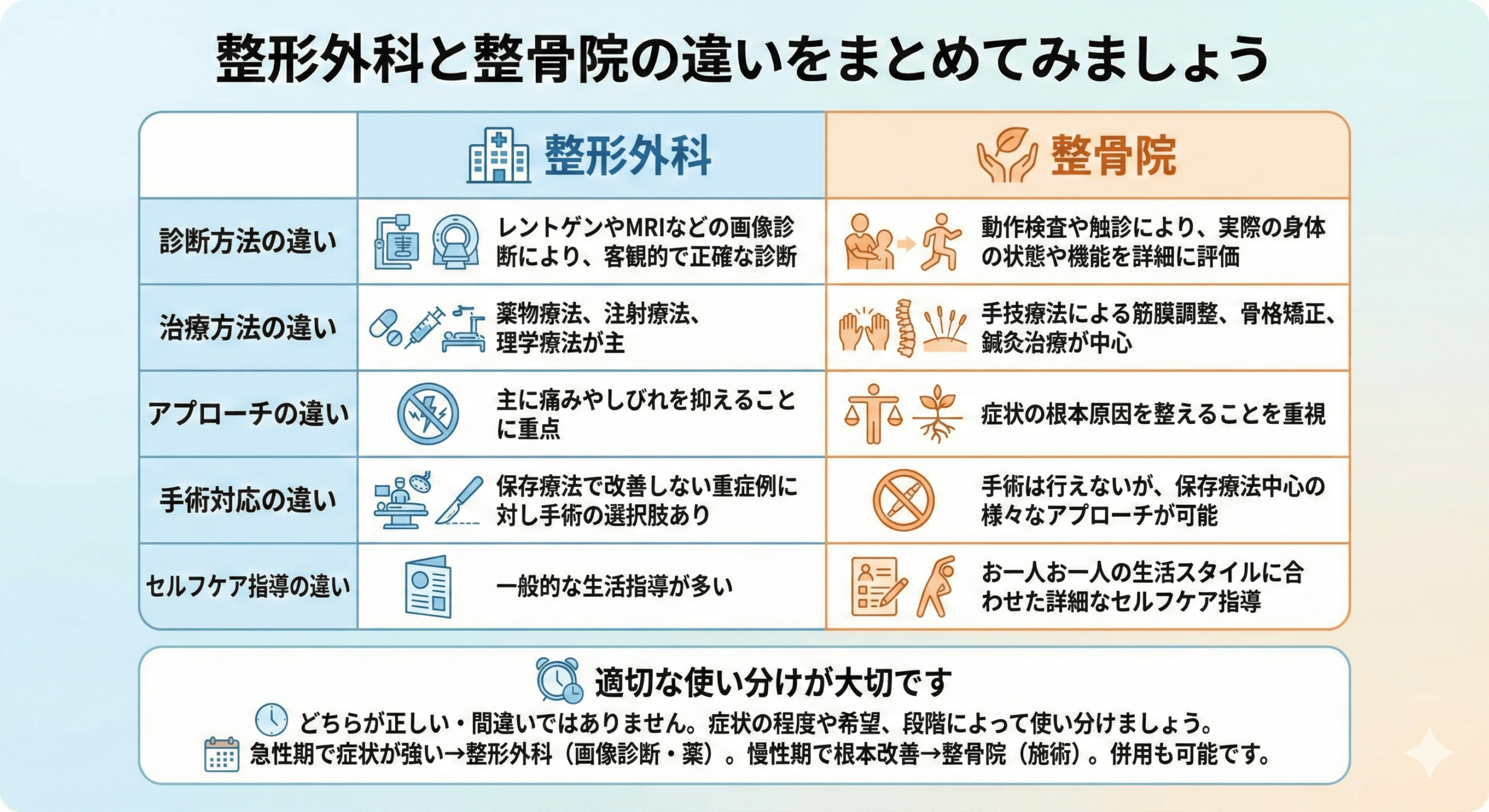 ここで、整形外科と整骨院の違いを分かりやすくまとめてご紹介します。