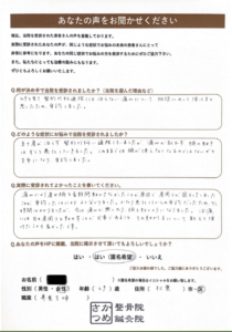 「初回受診の際に施術後、まだ痛みはあったものの、歩行が出来るようになり、ここに来て良かったと心の底から思えました。