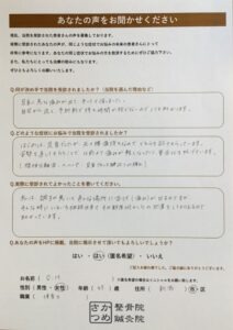 「調子が悪いと色んな場所に症状(痛み)が出るのですが、そんな時にいろいろ相談できてその都度何かしらの処置をしてもらえるので助かっています」というお言葉をいただいています。