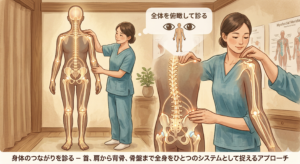 体全体を一つのつながりとして捉え、「なぜ首と肩に痛みが出ているのか」を見極めていきます。